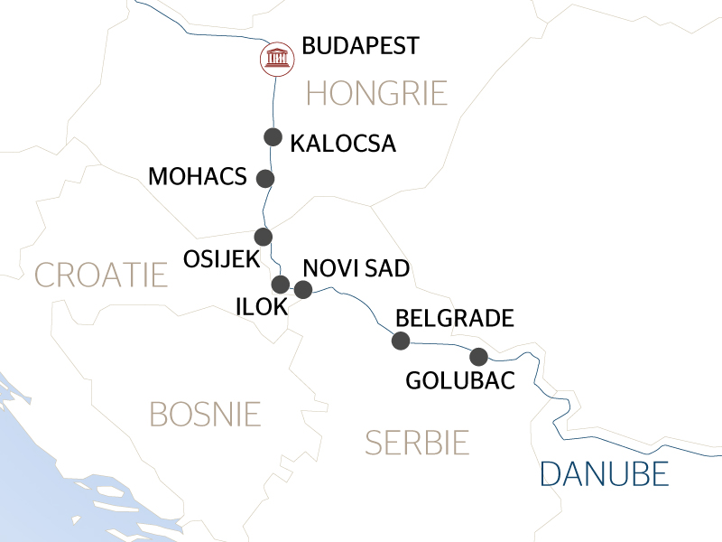 Assistez au plus grand défilé fluvial d'Europe : les Portes de Fer, à la lisière de la Roumanie et de la Serbie. C'est ici que le beau Danube bleu, fleuve le plus cosmopolite et pacificateur du continent, offre ses paysages les plus spectaculaires. Découvrez des villes aux multiples facettes telles que Belgrade, capitale jeune et moderne qui se situe au carrefour de ses influences orientales, slaves et autrichiennes. Admirez les vestiges des bains d'Hercule, l'une des stations thermales les plus anciennes et les plus réputées de Roumanie, puis parcourez 2000 ans d'histoire à travers Pécs et Budapest qui clôtureront un séjour magique à la croisée des cultures.