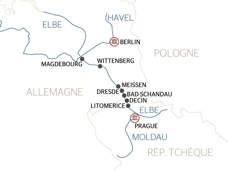 L’Elbe étant un fleuve sauvage, nous anticipons les variations de niveau d’eau. Aussi selon les conditions de navigation, nous pourrions être contraints d’inclure des nuitées en hôtels dans la région de Berlin et/ ou de Prague afin de garantir une expérience optimale. Si cette situation devait se présenter, CroisiEurope mettra tout en oeuvre pour organiser ces nuitées dans des établissements sélectionnés avec soin pour vous garantir confort et qualité de sorte à assurer et maintenir le programme de visites.