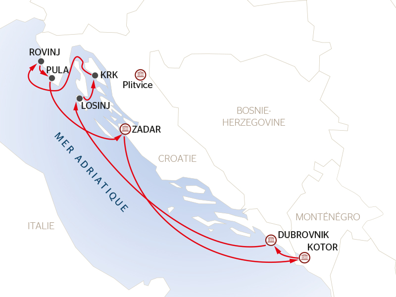 Embarquez pour une croisière inoubliable dans l'Adriatique et explorez les joyaux cachés de la côte croate et monténégrine. Découvrez les charmantes îles de Losinj et Krk, Rovinj et son port de rêve, et les trésors historiques de Pula, Zadar et Kotor. Naviguez à travers les archipels enchanteurs de Brijuni et Kornati, dans la baie de Kvarner, imprégnez-vous des paysages spectaculaires des bouches de Kotor et laissez-vous surprendre par une visite magique des lacs de Plitvice. Une aventure exceptionnelle vous attend, mêlant histoire, culture et beauté naturelle.