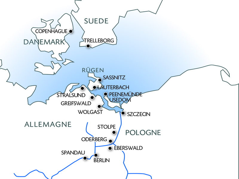 De Berlin à Copenhague, sillonnez la Havel, l'Oder et la mer baltique en croisière entre modernité et tradition, originalité et simplicité. Découvrez des villes à l'architecture unique telles Stralsund, classée au patrimoine mondial de l'UNESCO, mais aussi de spectaculaires côtes bordées de plages de sable fin et falaises de calcaire sur les îles d'Usedom et de Rügen. Visitez les vestiges de l'abbaye de Chorin, plus bel exemple d'architecture en brique d'Allemagne du Nord.