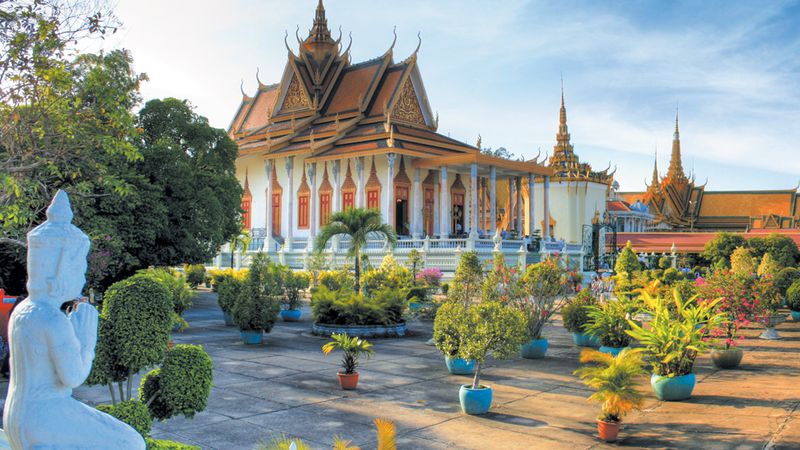 Visite du Palais Royal, cœur symbolique de la nation et de sa Pagode d'Argent, érigée en bois en 1892. Visite du Musée National. Déjeuner en ville. L'après-midi, visite de l'Ecole Tuol Svay Prey S21, ancien centre de détention des Khmers Rouges durant la guerre civile. Temps libre au marché local. De retour à bord, spectacle de danses Apsara. Dîner et nuit à bord, à quai dans le port. Soirée libre.