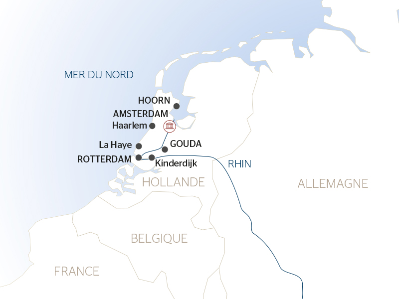 Une croisière sur le Markermeer et sur les canaux hollandais qui, outre les incontournables Edam, Volendam et Gouda, propose un programme de visites incluses inédites. Les moulins de Kinderdjik, un paysage unique, La Haye et la Mauritshuis ou encore le Rijksmuseum.