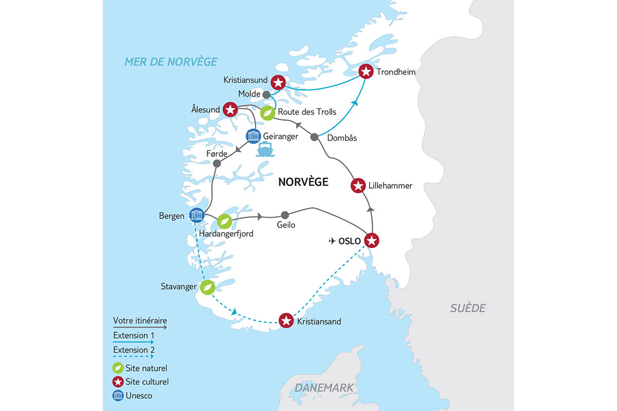 En mai, la route des Trolls est susceptible d'être encore fermée en raison de la neige. Les itinéraires et sites indiqués ne sont que des suggestions. Les distances kilométriques journalières sont calculées sur la base de la route la plus directe. Obligatoire : arrivée/départ à l’aéroport d’Oslo-Gardermoen. La capacité d’hébergement ne permet pas de garantir un même lieu d’hébergement pour des réservations de plus de 2 chambres.