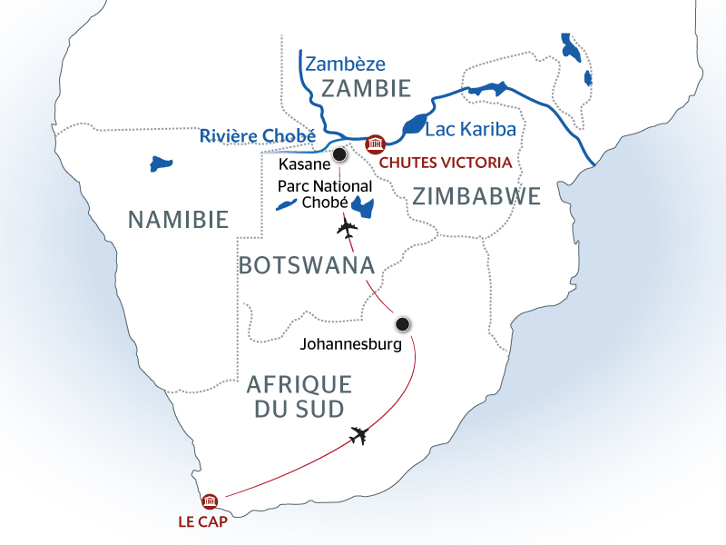- Les vols internationaux ne sont pas inclus, nos prestations commencent à l’hôtel au Cap et se terminent à l’hôtel de Victoria Falls.