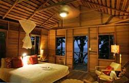 La particularité du Jungle Bay, c’est trente-cinq bungalows meublés avec goût, construits dans du bois solide tropical, élevés sur des pilotis en bois, blottis au-dessous de la jungle paisible de la Dominique. Les bungalows sont spacieux et tout le mobilier en bois est "conçu et construit" dans le Resort.