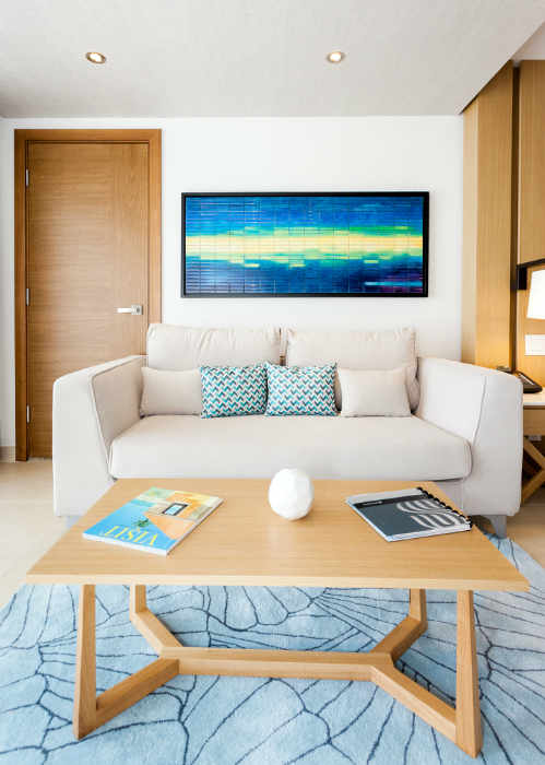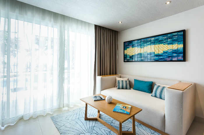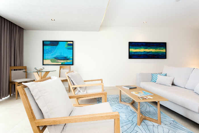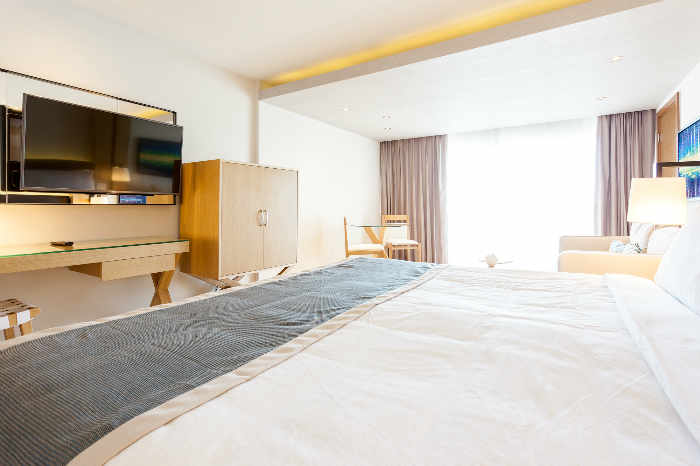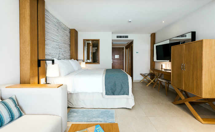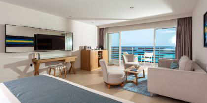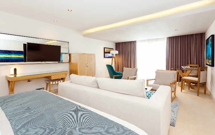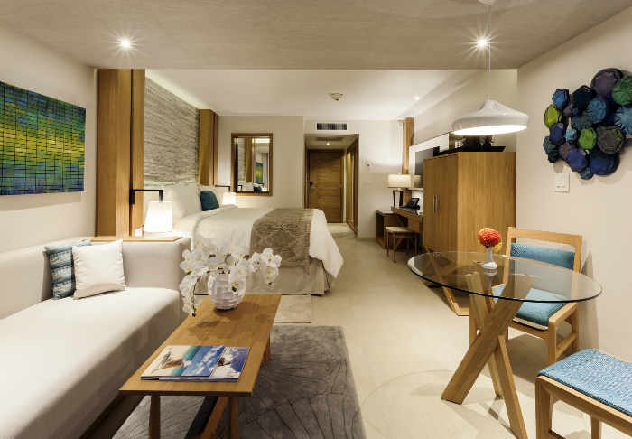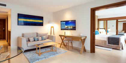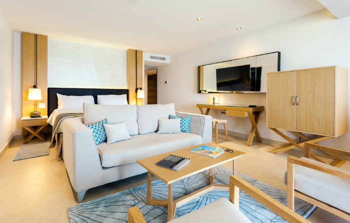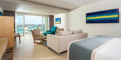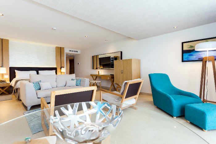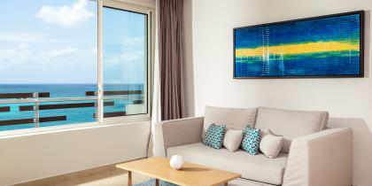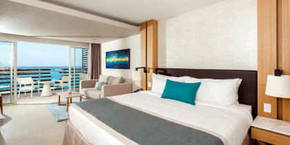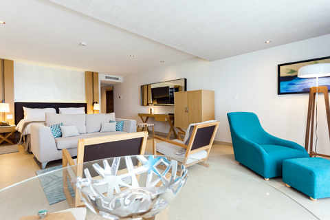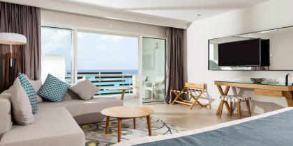 Cette suite offre un accès facile à la piscine et à la magnifique vue donnant sur la mer, depuis la grande terrasse. Cette catégorie de chambre très convoitée, offre un vaste espace avec un lit king size, un salon spacieux, un canapé somptueux, une table basse et deux chaises confortables.