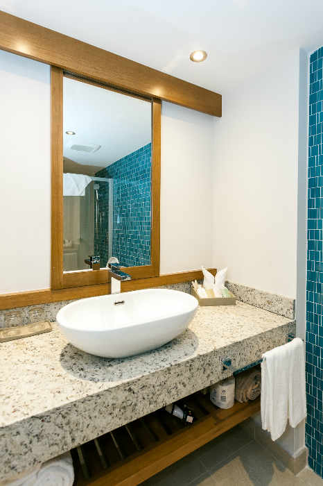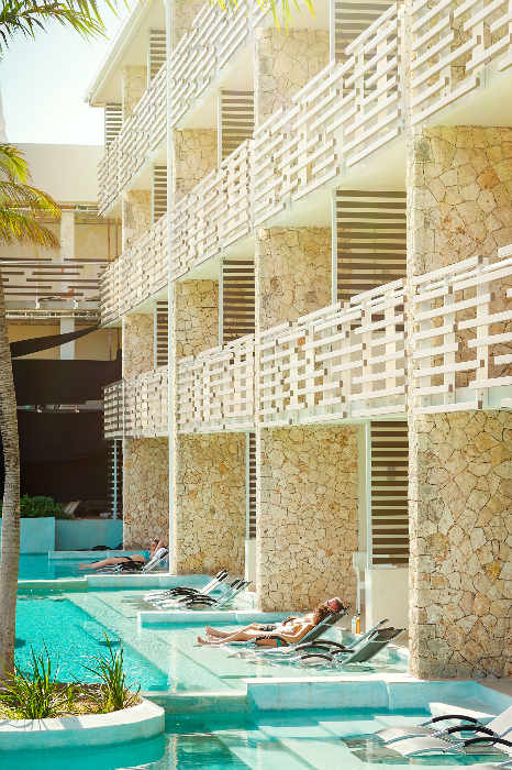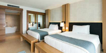 La vue depuis la terrasse donne sur la magnifique architecture du restaurant Azul et la piscine Edge. Les salles de bain sont dotées d'un double lavabo, d'une grande baignoire et d'une douche séparée.