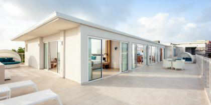 Située au cinquième et au sixième étage de l’hôtel, la suite offre un lit king size avec vue panoramique sur l'océan. Le salon surdimensionné dispose d'un somptueux canapé en forme de L avec une table basse, un long bureau, et deux chaises confortables encadrant une table ronde en verre. La grande terrasse dispose d'un lit baldaquin confortable, idéal pour admirer les magnifiques couchers de soleil. La grande salle de bain dispose d'un double lavabo, d'une grande baignoire et d'une douche séparée.