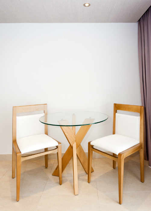 Vous trouverez un lit king size au centre de la pièce dans le même ton que le salon, avec un somptueux canapé, une table basse et deux chaises confortables autour d’une table ronde en verre qui ajoute de la convivialité et de la beauté à la suite.