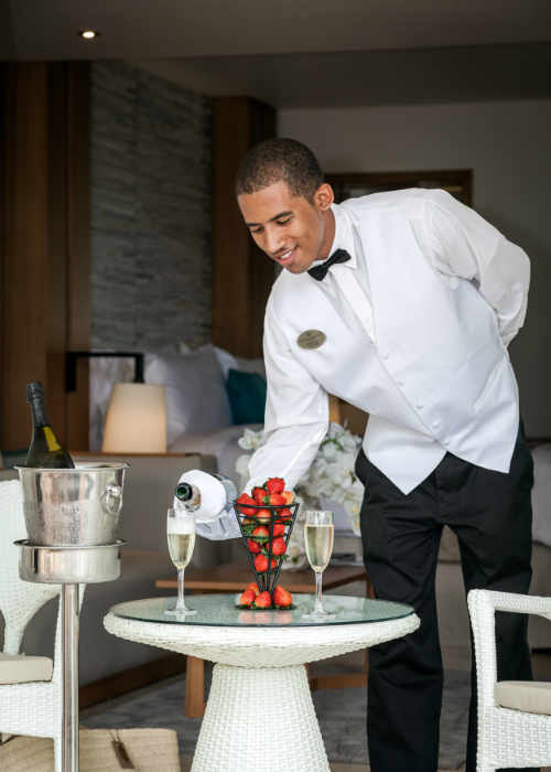 Toutes les suites Sunset Swim Out Butler incluent un service de majordome pour toute la durée de votre séjour avec en outre, un réfrigérateur réservé au vin offert (au choix) : une bouteille par jour pour cinq nuits de réservations ou plus, à partir d'une sélection de bons vins locaux et internationaux.